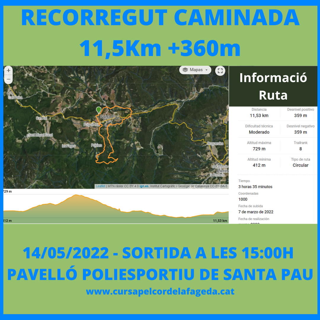 La sortida serà a les 15:00 des del Pavelló Municipal d’Esports de Santa Pau i seguirem una part del recorregut d’Itinerannia anomenat Ruta de la Fageda Fosca. Ens dirigim per una pista cap a Escolls on agafarem un corriol estret i sense gaire desnivell que ens portarà a Collet de Maria, quan arribem aquí girem a la dreta i agafem un corriol que ens porta a Can Xart, aquí s’acaba el bosc d’Alzinars i Roures i comencen les Fagedes. El punt més alt del recorregut és el Terreller Blanc on s’inicia el corriol de les Marrades que porta al Grau. Deixem el recorregut d’Itinerannia de la Fageda Fosca i en lloc de pujar a les Marrades baixem per la pista que ens portarà a la Vila Vella de Santa Pau, tot passant per Plaça Ribera i Les Costes d’en Simó. En arribar a la Vila Vella passarem pel portal de la Muralla i entrarem a la Plaça Major de Santa Pau on trobarem el primer avituallament al quilòmetre 7. A partir d’aquí seguirem una part del recorregut d’Itinerannia de la Ruta dels Gorgs de Santa Pau. Sortirem de la Vila Vella pel Portal de Mar i baixarem en direcció al Pont d’Instins i el Riu Ser. Anirem vorejant el riu Ser tot passant pel Gorg de Cagarrates que és mil vegades més maco que el seu nom. Travessarem la carretara de Mieres i passarem pel Camping Mas Patxet, passarem per la Font Fresca i anirem en direcció al Veïnat de Sant Martí, travessarem el bosc de Rifago per arribar a Can Sidric i fer un petit corriol de pujada per enllaçar amb els altres recorreguts i compartir els darrers metres fins al Pavelló Municipal d’Esports de Santa Pau on ens espera un magnífic avituallament final.