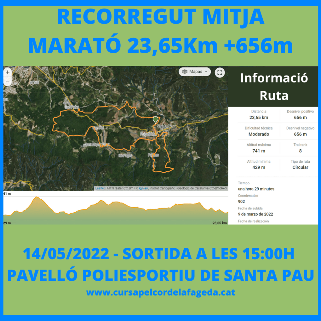 La sortida serà a les 15:00 des del Pavelló Municipal d’Esports de Santa Pau, ràpidament ens dirigirem a la Serra de Finestres on passarem per Can Xart i a partir d’allà podrem gaudir d’1,5 quilòmetres de Fageda. En arribar al punt més alt del recorregut a 739 m d’altitud i el quilòmetre 3,8, baixarem en direcció al poble per la mateixa pista que vam fer el novembre de 2021 en pujada. En arribar a la Vila Vella de Santa Pau trobarem el primer avituallament a la Plaça Major de Santa Pau. Després d’un recorregut per la Vila Vella anirem en direcció al Volcà Rocanegre on ja compartirem pràcticament tot el recorregut amb la cursa curta. Del Volcà Rocanegra anirem en direcció al Volcà Santa Margarida vorejant-lo pel nord i baixant a Pla Sacot, d’allà una petita pujada fins a l’església de Sant Miquel de Sacot on trobarem el segon avituallament al quilòmetre 11,7. A partir d’aquí fem una petita baixada per arribar a La Fageda d’en Jordà. A la Fageda farem un recorregut diferent de la Cursa Curta per tal de preservar els corriols de la Fageda. Sortim de la Fageda i pujarem en direcció a les Grederes del Volcà Croscat, abans d’arribar-hi ens trobarem el tercer avituallament a La Pomereda al quilòmetre 19. Tot fent una part del recorregut del Trenet dels Volcans iniciarem la baixada en direcció al Veïnat de Sant Martí i tot vorejant la muntanya de Pedragudes arribarem al Pavelló Municipal d’Esports de Santa Pau on ens espera un bon avituallament merescut després de 23,5 quilòmetres, més que una mitja marató és una mitja i pico. En tot cas és menys exigent que la Mitja Marató de la Cursa pel Cor de la Fageda del novembre de 2021.
