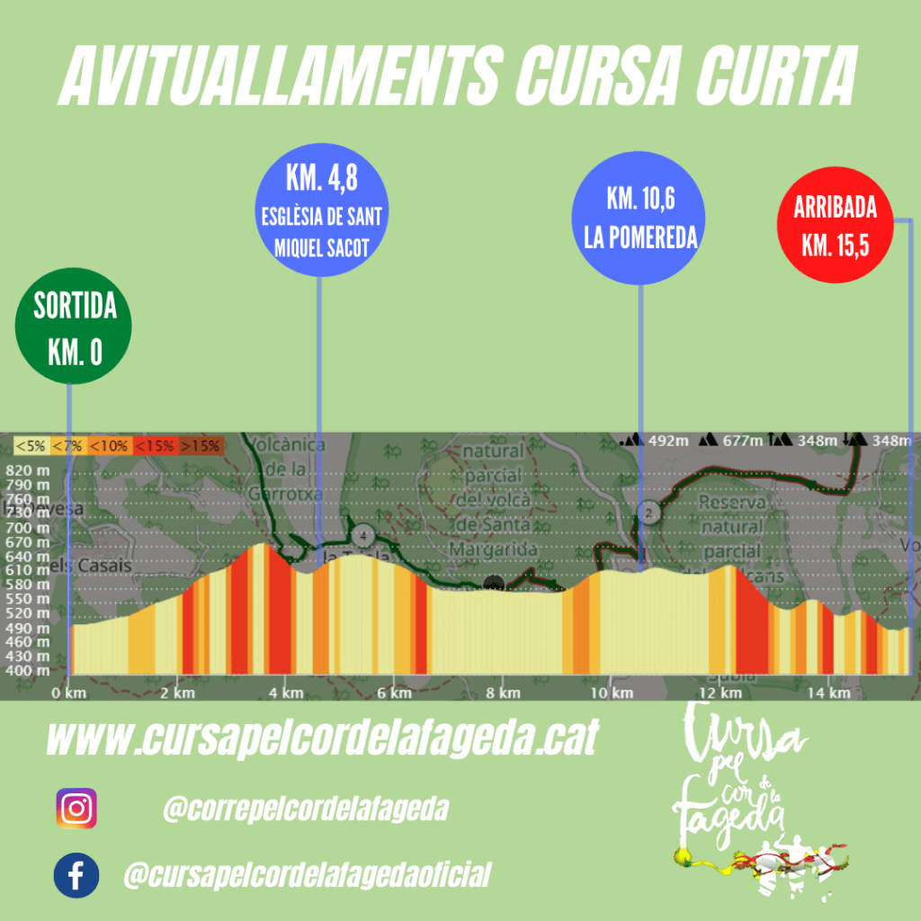 La sortida serà a les 15:15 des del Pavelló Municipal d’Esports de Santa Pau, ràpidament ens dirigirem en direcció al Volcà Rocanegre on hi arribarem per una pista asfaltada que ens ajudarà a estirar la cursa. Del Volcà Rocanegra pujarem en direcció al Volcà Santa Margarida vorejant-lo pel nord, i baixarem a Pla Sacot, d’allà una petita pujada fins a l’església de Sant Miquel de Sacot on trobarem el primer avituallament al quilòmetre 4,8. A partir d’aquí fem una petita baixada per arribar a La Fageda d’en Jordà. A la Fageda farem un recorregut diferent de la Cursa Llarga per tal de preservar els corriols de la Fageda. Sortim de la Fageda i pujarem en direcció a les Grederes del Volcà Croscat, abans d’arribar-hi ens trobarem el segon avituallament a La Pomereda al quilòmetre 10,6. Tot fent una part del recorregut del Trenet dels Volcans iniciarem la baixada en direcció al Veïnat de Sant Martí i tot vorejant la muntanya de Pedragudes arribarem al Pavelló Municipal d’Esports de Santa Pau on ens espera un bon avituallament merescut després de 15,5 quilòmetres. El recorregut és molt menys exigent i amb menys desnivell que la Cursa pel Cor de la Fageda de 14 km del novembre de 2021.